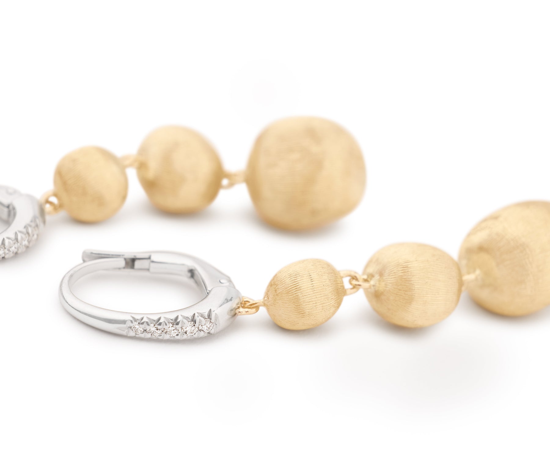 These sophisticated earrings feature three graduated spheres in 18K yellow gold, finely hand-engraved using the ancient Florentine technique. Each earring has seen set with an elegant diamond pavé clip, adding a touch of dazzle to any look.