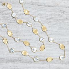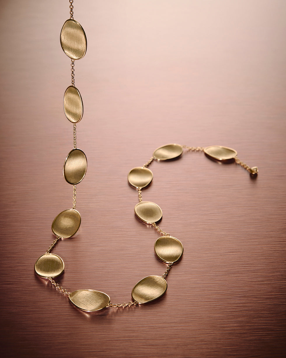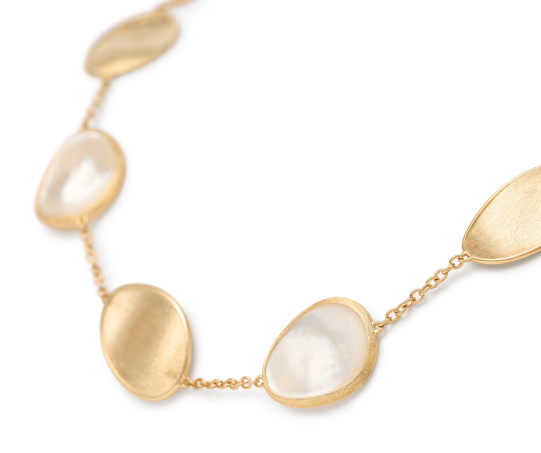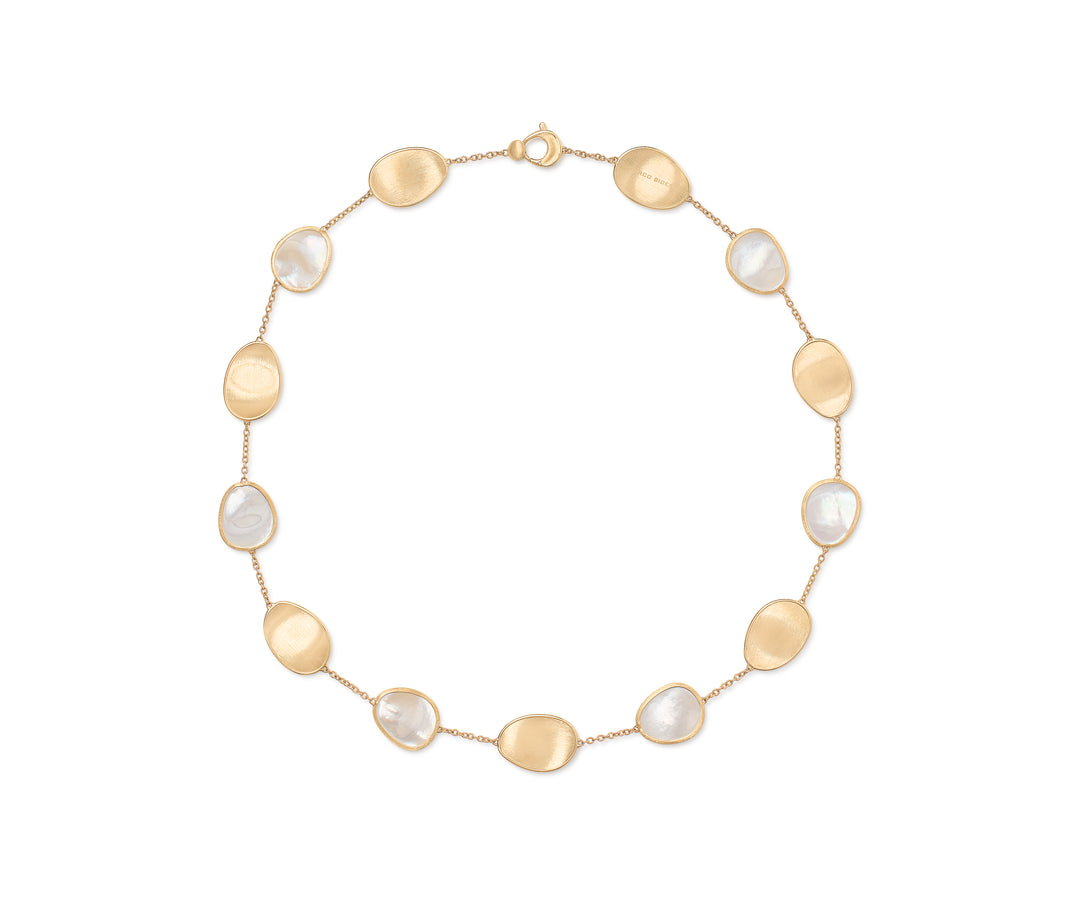 Elegant and minimalist, this necklace comprises a regular sequence of light 18K yellow gold leaves and mother of pearl. The gold leaves are hand-engraved using the ancient Florentine technique, alternated with a slender chain. Perfect to complete any look and add a finishing touch of light.