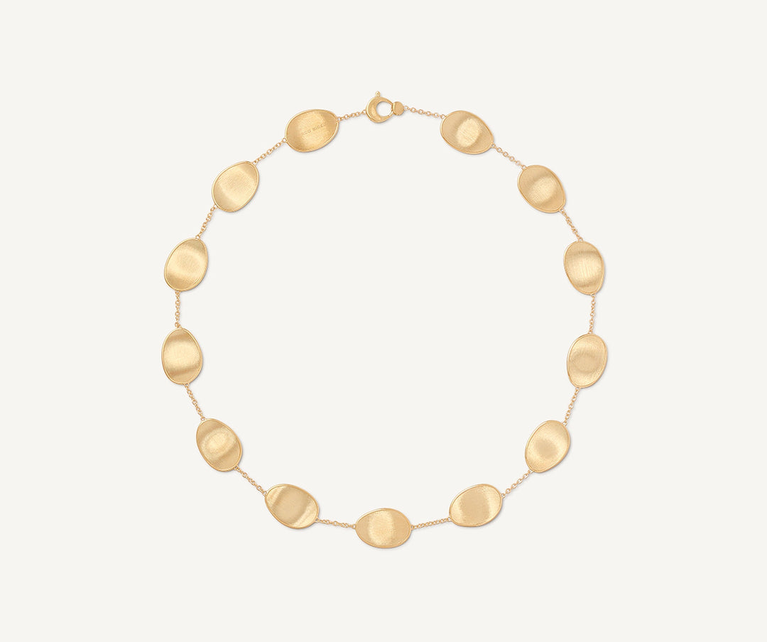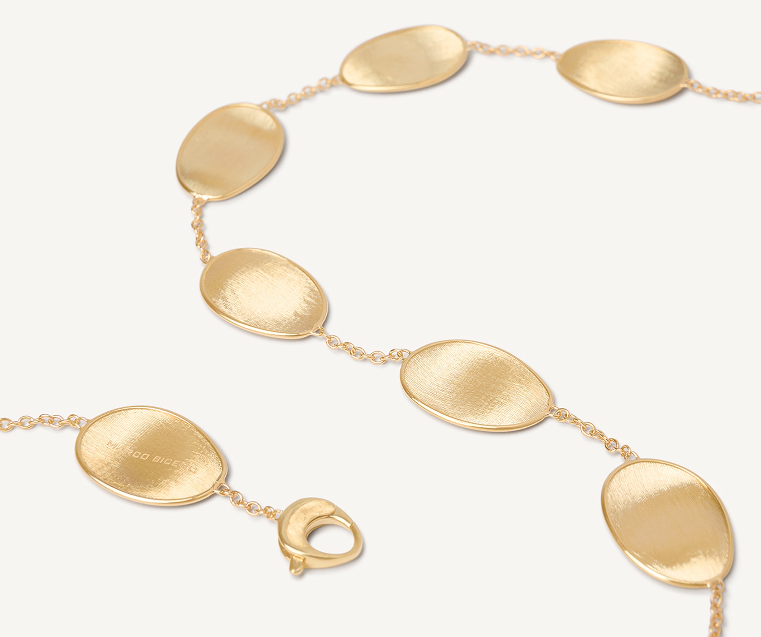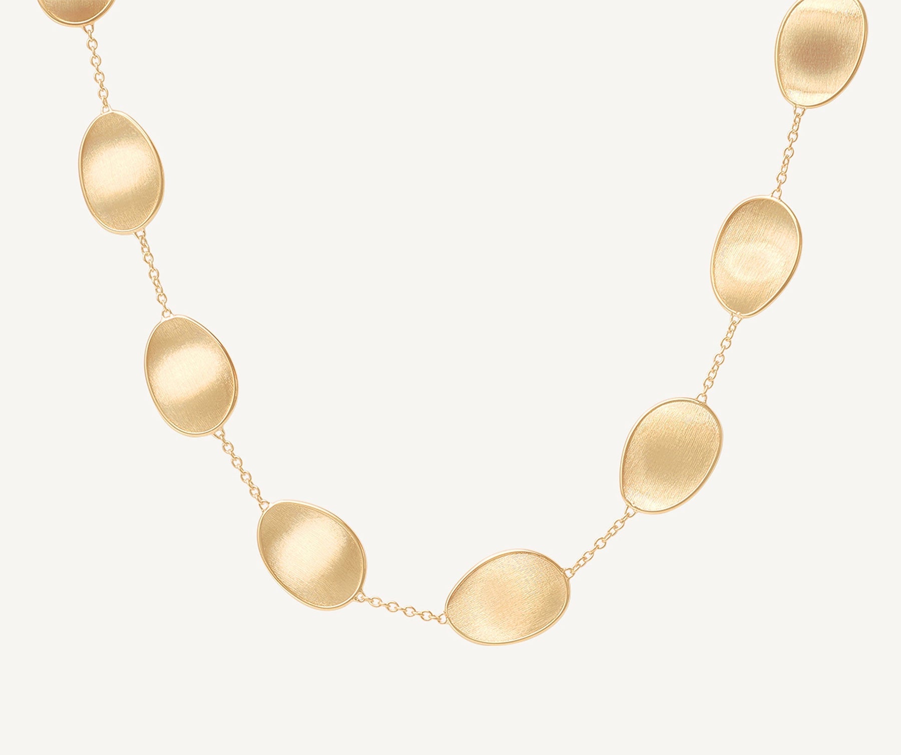 Elegant and minimalist, this necklace comprises a regular sequence of light 18K yellow gold leaves and mother of pearl. The gold leaves are hand-engraved using the ancient Florentine technique, alternated with a slender chain. Perfect to complete any look and add a finishing touch of light.