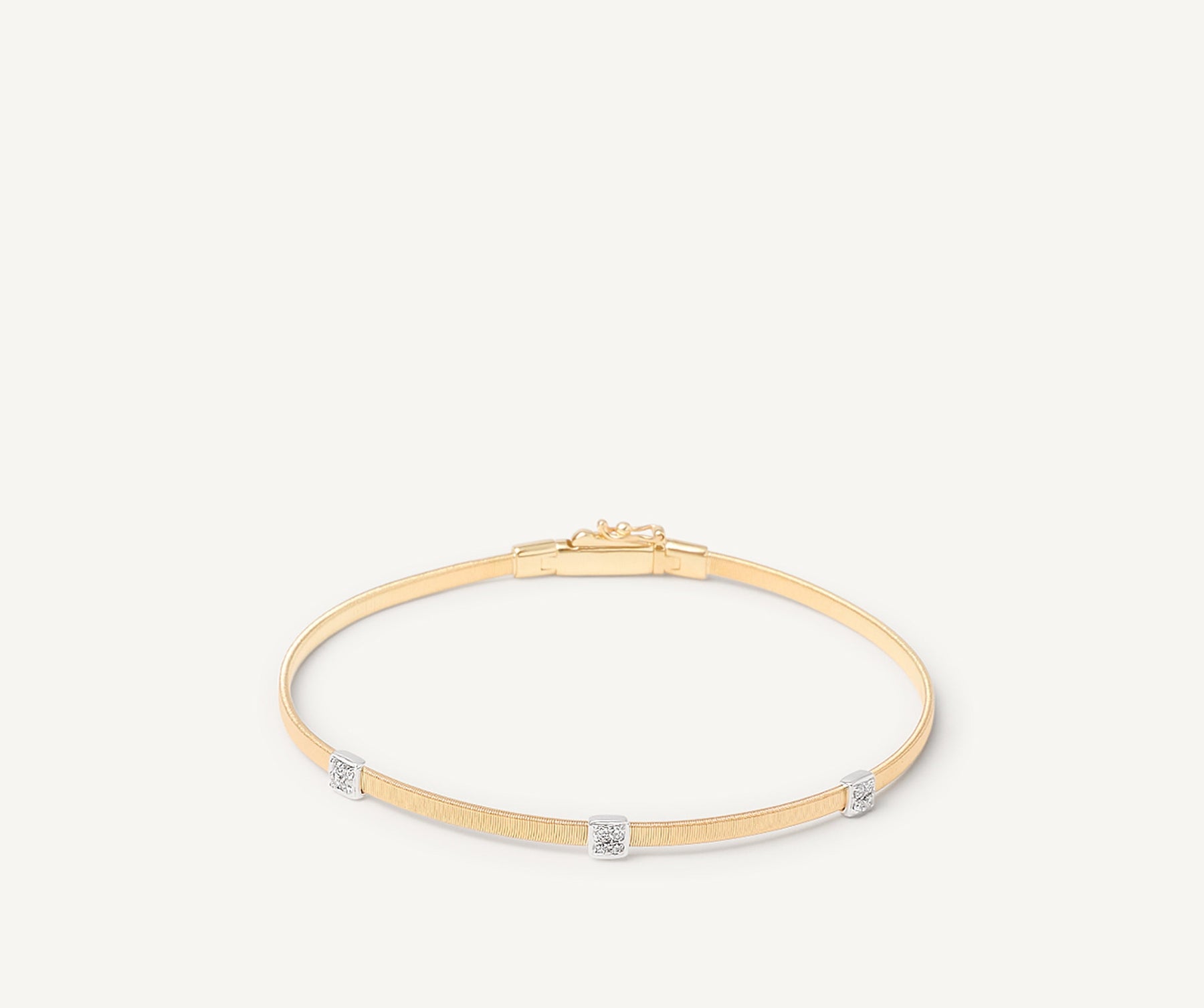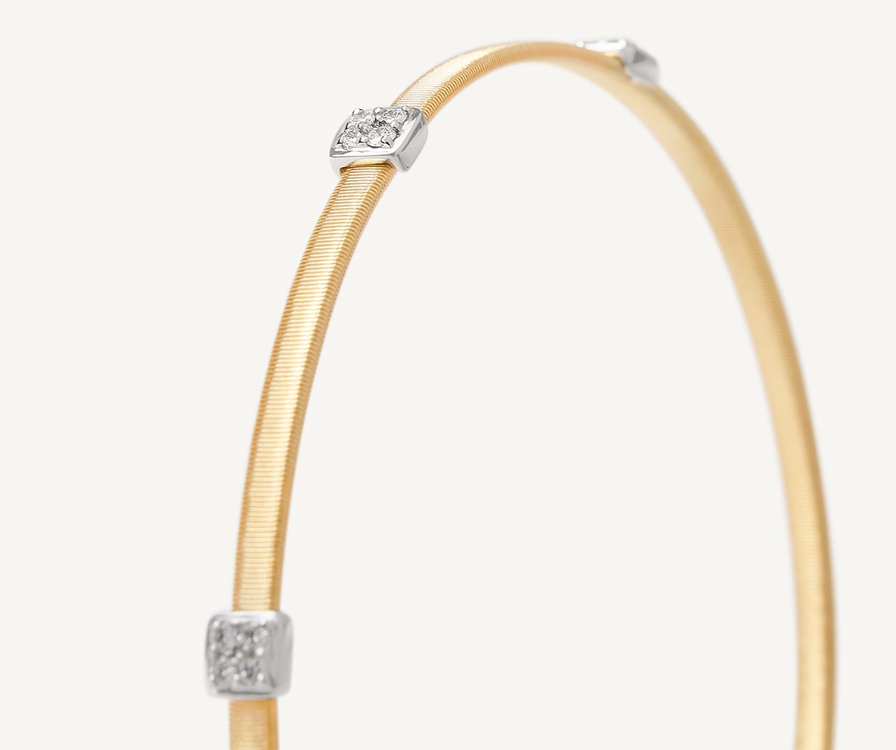 Elegantly understated, this single-strand flat coil bracelet bears the hallmark of a true timeless classic. Crafted in 18K yellow gold, it is embellished by a brilliant-cut diamond pavé. Elegant on its own, it is perfect when matched with the other Marco Bicego jewels.