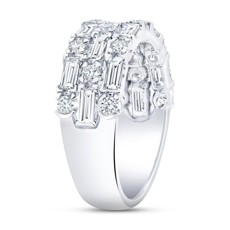 This stackable collection 3-row fashion ring is splendid to add to your collection. Outlined with 14 round diamonds weighing 0.41 carats, and 13 baguette diamonds with a total weight of 1.10 carats in an attractive setting.